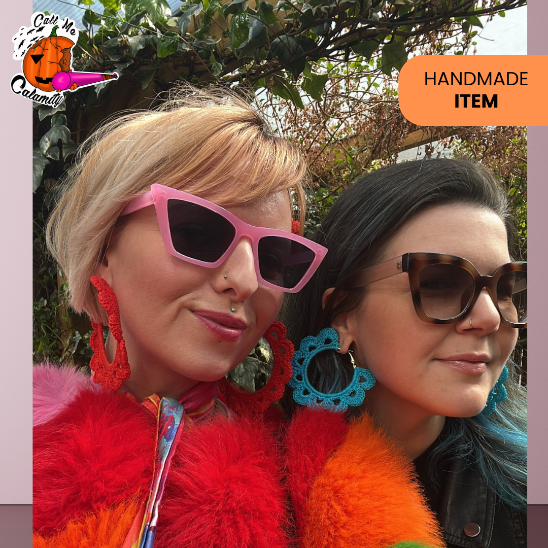 These earrings are the perfect pop of colour to any outfit, made with cotton crochet thread they come in three sizes small, medium and large and can be made in almost any colour! just put your requests in a comment on your order or drop me an email